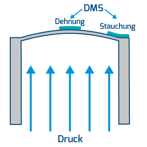 Anders als metallische DMS, die auf nahezu jedes Material aufgebracht werden können, werden die Halbleiter-DMS in die Membran integriert. Die DMS und der Verformungskörper basieren daher auf demselben Halbleitermaterial – typischerweise Silizium. Vier DMS werden in der Membran wiederum zu einer Wheatstone’schen Messbrücke verschaltet.