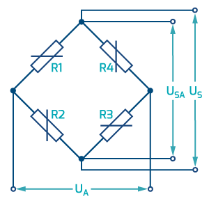 Auf metallischen oder piezoresistiven Dehnungsmessstreifen (DMS) beruhende Drucksensoren werden zu einer Wheatstone´schen Brücke verschaltet. Auch diese Sensoren können direkt an den dydaqlog Datenlogger angeschlossen werden. Der Datenlogger stellt eine stabilisierte Gleichspannung US zur Brückenspeisung bereit. Die Widerstände R1 / R2 sowie R4 / R3 bilden in jeder Brückenhälfte einen Spannungsteiler, an deren Knotenpunkten die Brücken-Ausgangs-Spannung UA abgegriffen wird. Verändern sich durch Stauchung oder Dehnung die Widerstände der DMS in den beiden Brückenhälften, wird die Brücke „verstimmt“ und die Ausgansspannung verändert sich ebenfalls. Vereinfacht dargestellt berechnet der dydaqlog Datenlogger aus der Differenz der Speisespannung und der Ausgangsspannung die Größe des Drucks, der auf die Membran des Sensors einwirkt. Zur Erhöhung der Genauigkeit wird hierbei die Speisespannung direkt an der Messbrücke „zurück“ gemessen (USA).