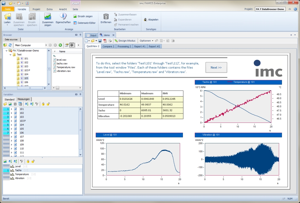 Woher Ihre Messdaten auch stammen, ob von einem Testaufbau, einem Prüfstand oder von einer mobilen Messung. FAMOS enthält alle Werkzeuge, die Sie zur professionellen Analyse und zum Visualisieren Ihrer Messdaten benötigen - vom Daten-Import bis zum druckreifen Report. Eine große Anzahl fertiger Analysefunktionen und Automatisierungsoptionen sorgen für eine gründliche Auswertung der Messdaten und liefern aussagekräftige Ergebnisse.